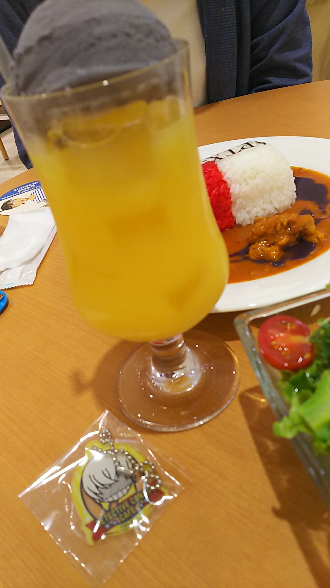 ドリンクは安室さんのトリプルフェイスなんちゃら~ドリンク。ごまアイスが乗ったオレンジジュースと、アクキー付。かわいい。