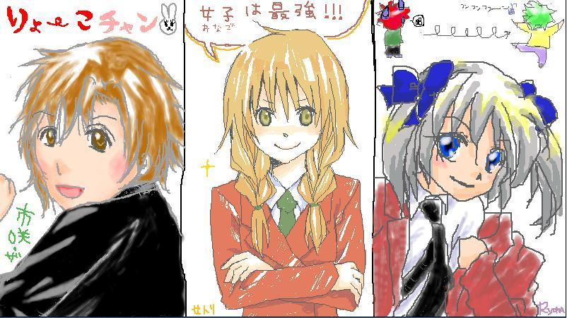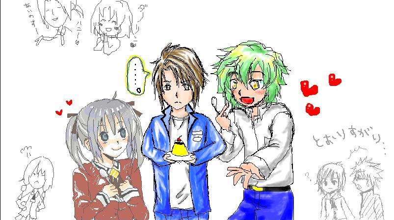 らくがきしながら使い方を教わり、早くも調子に乗り始めます。 実はそのらくがきとお喋りだけで、最初の2時間を潰したとかここだけの話! まずは螺旋3人娘。 キャラ選は、あみだで決めたような気がします。ココからあみだ祭は始まっていたのだ・・・! 左から、市咲さん、せんりさん、私。 分かる人には分かる、あの扉絵をイメージです。理緒の後ろにいる2匹はオプション(有料)です。 市咲さんの『・ザ』は、まさかの略名です。これは内輪ネタだから秘密☆ 次何描くー?そういえばもうすぐ(この時点で次の日)七夕ですねー、という話をしながら、うにょうにょと出来上がっていたらくがき(笑) 浮いてる団子が、某誌のマスコットキャラに見えて仕方なかったのは私だけ? ここでブリーチならイケる?という話になり、各々で織姫ちゃんを描いたら、何となく満足してしまって早々に次へ(早) 新たなジャンルを模索すべく、描けるタイトルを羅列してくれるお2人、の文字にマルバツで答える綾奈(横着) カブったのは、螺旋、脱色、鋼?ということで、再びあみだの結果、螺旋に決定。 さらにキャラを決めるべく、三度あみだ。あみだ大好きですこのひとたち。 で、結果。 理緒:せんりさん、歩:市咲さん、火澄:綾奈。厳正なる あ み だ の結果です(主張) 周りのオマケは、ひよのさんと清隆がせんりさん、まどかおねーさんが綾奈、通りすがりな香亮が市咲さん。 最初は、理緒が両手に花!とか言って喜んでたんですが、話しているうちに歩を挟んだ方が現実的、ということになり、最終的には全力で歩争奪戦を・・・さながら、なりきりチャット的なノリで・・・!! 冷蔵庫のプリンは誰にも渡せへん・・・っ!誰も来んな、俺らの愛の巣にーッ!! ・・・と叫んだら、冷静にツッコまれました。大好きです(告白) 最後にブリーチぶりーち。 何か、喋りながらぼんやり描いてたら、描くトコなくなりました(笑) 一応これも左から、せんりさん、市咲さん、綾奈で並んでます。 ボニーちゃんの熱い視線の背後で、夜が明けました。まさかの6時間耐久絵茶。 最後に次回のお約束をして、第1回は元気にお開きです。 嘘です、お腹が空いたばっかり言って終わりました。夜更かしは空腹との戦いです。 第2回は1週間後!続くよ次回!! PR 2008/08/29(Fri) 00:33:11