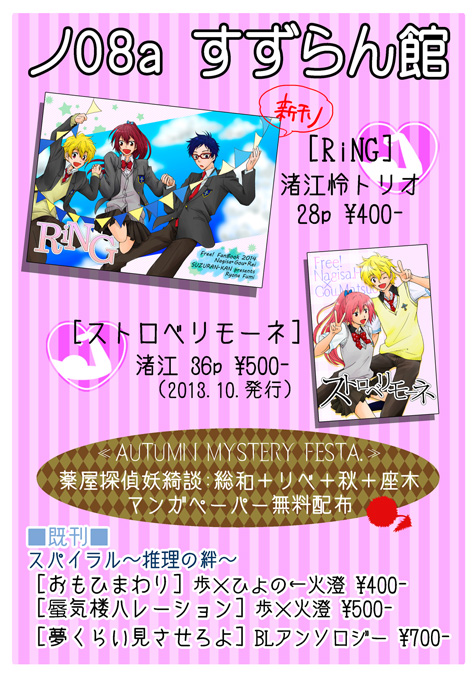 普段ブルー系が多いので、弾けるピンクが眩しいよ! 配置は東2ホールです。ノ08a、Free渚江sp!両隣もなぎご!! Freeと螺旋の既刊も持ち込みますので、どうぞよしなに。 (今回リボは持ち込まない予定です) 江プチのポスカラリーに参加申請していますので、Free本お買い上げの方に先着でラリー用ポストカードを差し上げます。 新刊、既刊は問いません。 ちなみに絵柄は新刊表紙絵の背景違いです。トリオカラーにしてみました。 薬屋は紆余曲折の末、マンガペーパーを無配することにしました。 元々はコピ本にするつもりでネーム作ってたんですが、この内容で販売するの申し訳なくなってしまったので…これからペーパーボリュームにまとめ直します。何とかします。 最早期待を裏切らない、総和さん+薬屋3人の小咄です。 どうかお気軽にお持ちくださいませませ。 今回も目印に立体毛玉こと原型リベ置いときますー。自作じゃないよー頂き物だよ! また今冬発行予定の香介×亮子アンソロジー【幼馴染みってのはいいもんだな】のフライヤーをお預かりする予定です。 新フライヤー何気に4種も!あるらしいので!!どれをどう配布するのかはわからないのですが、実は内2種の制作をお手伝いさせて頂いてます。 友方ヒカルさんと合同で!お互い浅月のイラストを作成→亮子と背景etc.を描き足して主催様に提出!ということをやらせて頂いて、大変大変楽しかったので!! イラスト自体は告知サイトで既に発表されていますが、フライヤー実物もゼヒお手に取って頂けたら光栄です!! あとは恒例、カーニバルのアンソロジーも持ち込みます。 今回在庫の関係で、私の卓はBL版のみの頒布です。 カーニバル片割れ藤崎友樹くん(東2ネ71b)と、今回ご厚意でかいゆりえさん(東4せ14a)も卓に置いてくださるそうなので、NL版が欲しい方はそちらでお願い致します。 あとあと今回、いつもの売娘をお願いできるかわからないので、もしかしたら開始30分くらいはsp空けてお買いものしてるかもしれません…。 とりあえず確認してみます。場合によっては当日の朝ミーティングしてるかもしれないです。笑 2014/10/11(Sat) 02:29:02