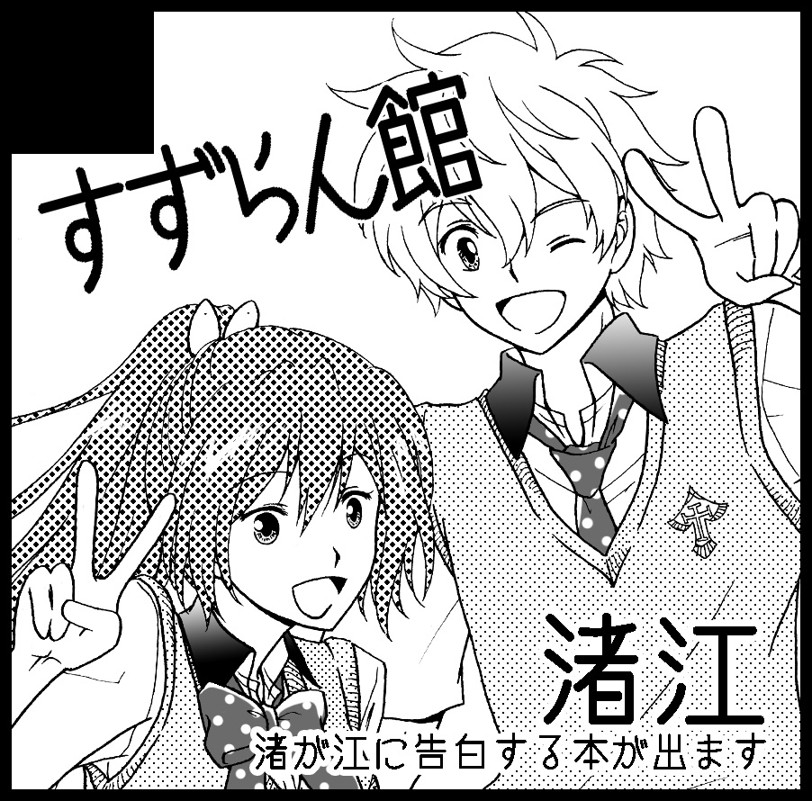 とりあえず表紙を添付しまっす!! シンプルイズベストを地で行ってますが、完成本にはオプション加工がつくんですよ。使いたくて使いたくて仕方なかったオプションなので、すごい楽しみなんですが、正直完成がうまく想像できてません。← 中身のサンプルは明日作りますー。 いちお仕様は、B5サイズ36pで500円予定です。 内容は丸っとマンガ1本。付き合う前の話です。 糖度は低目なんだと思いますが、すずらん館的にはこんなまっすぐに恋愛話を描くのが久し振りな気がしてね、うふふふふって感じです。 ちなみに表紙で2人がピースしてるのは、本作る準備始めた当初から決めてました。 なんか、あぁこの2人ってピースなんだなって思ったからだったんですが、まさかエンドカードで2人がピース揃えてくるとは予想してなかったんですよ…かわいかった…(遠い目) PR 2013/10/22(Tue) 00:38:38